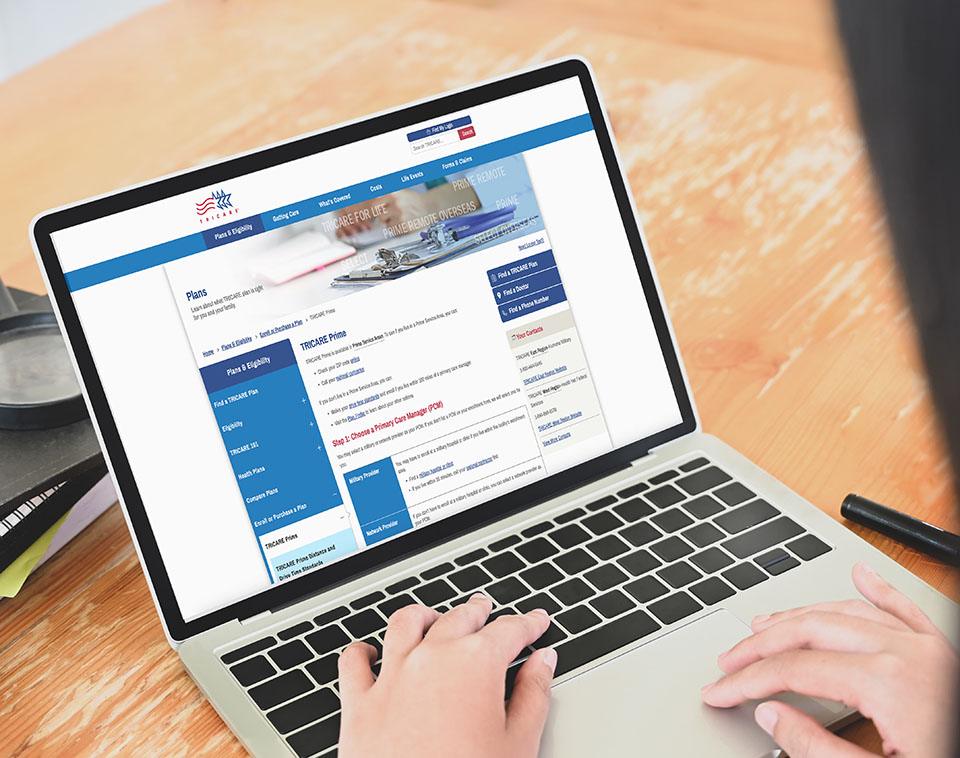 Person at laptop showing the Tricare home page