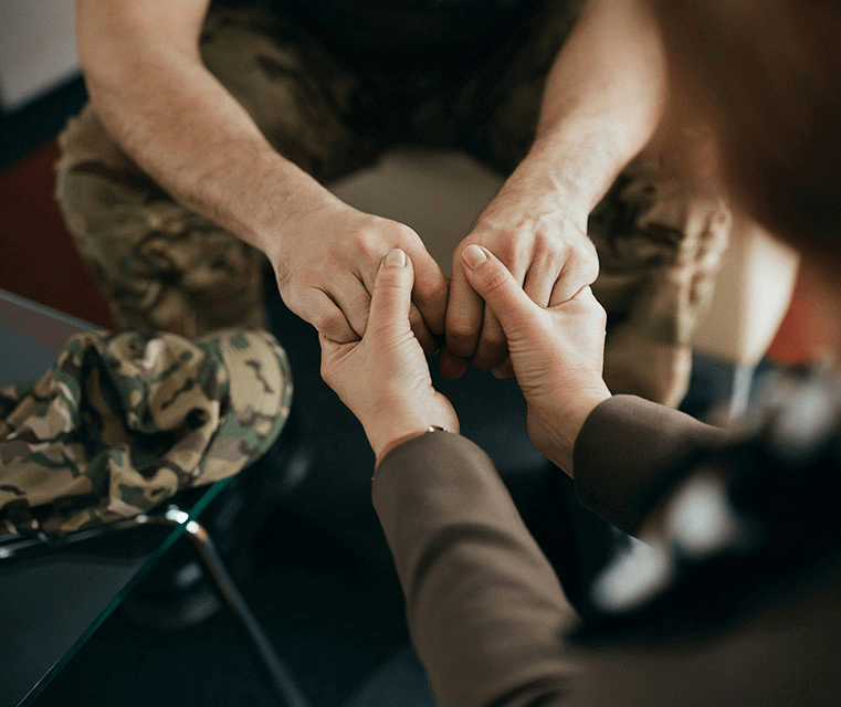 military man with depression holding hands with a caretaker